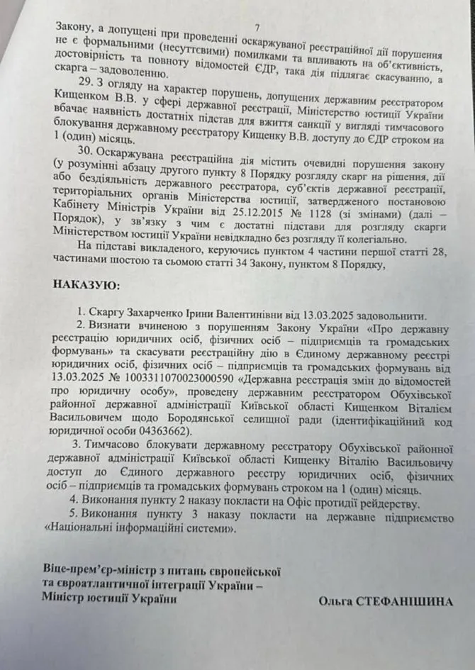 Цим рішенням суду скасовано наказ Мін’юсту №616/5 від 04.03.2025 р. Утім, на його підставі реєстратор не може внести Олександра Сахарука до реєстру як голову, оскільки він фактично відсторонений на підставі іншого, пізнішого, наказу Мін’юсту №793/5 від 19.03.2025 р. На підставі цього ж наказу в реєстрі поновлено відомості про Захарченко Ірину Валентинівну як в.о. селищного голови.